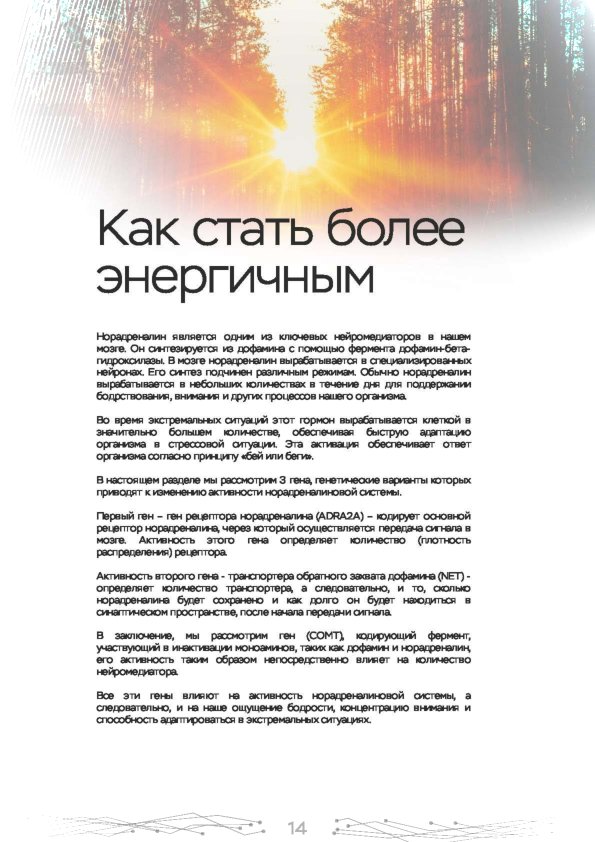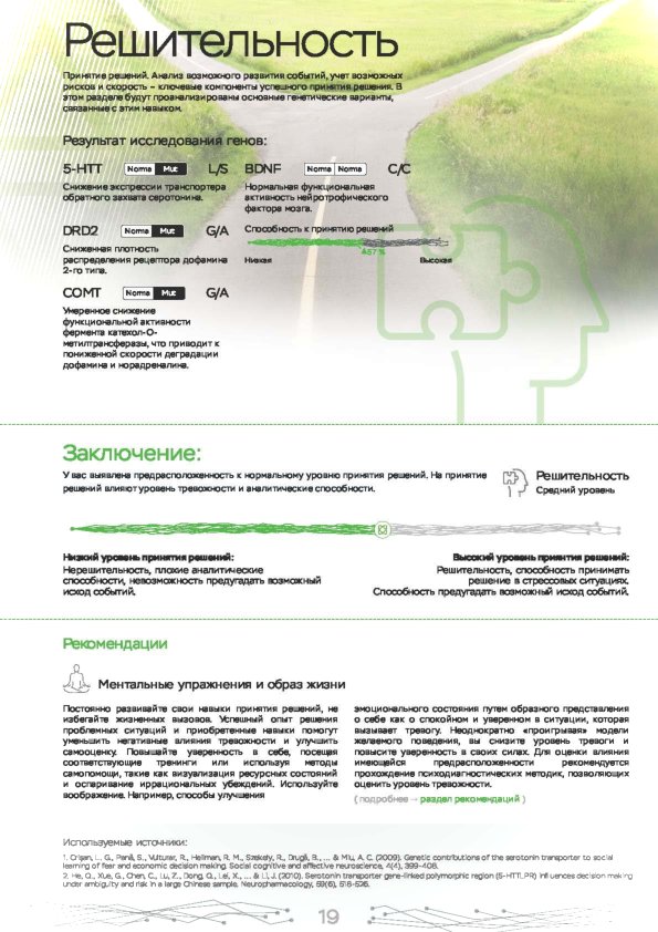 Этот ДНК анализ показывает влияние наиболее важных 10 генов на психическое и эмоциональное состояние. Именно они регулируют выработку гормонов, работу нейромедиаторов. Используйте знания о природных свойствах своего организма для борьбы со стрессом, повышения работоспособности и общего тонуса. Каждый человек индивидуален, поэтому мы рекомендуем пройти наш генетический нейро тест в Электростали.